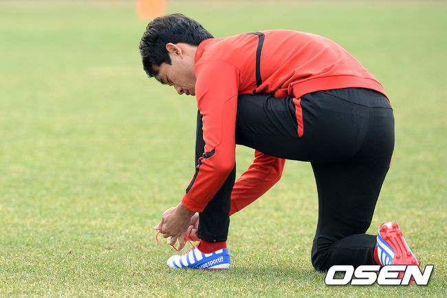 박주영이 훈련에 앞서 축구화 끈을 조여매고 있다.