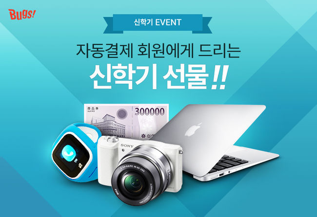 먼저 신학기 선물로 인기가 높은 맥북에어, 소니 미러리스 카메라, 백화점 상품권, 웨어러블 키즈폰 등 4가지 경품을 제공한다. 벅스 웹과 모바일 애플리케이션에서 참여할 수 있다. 이벤트 대상 회원이 원하는 상품 한 가지를 선택해 응모하면, 추첨을 통해 총 4명에게 해당 제품을 선물하는 방식이다.