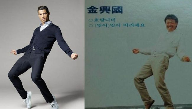 바로 20여년 전 김흥국의 '호랑나비' 앨범 사진과 똑같은 포즈였기 때문. 몸을 뒤로 살짝 젖힌 뒤 양 팔을 벌리고 있는 모습은 호날두와 김흥국이 똑같았다.