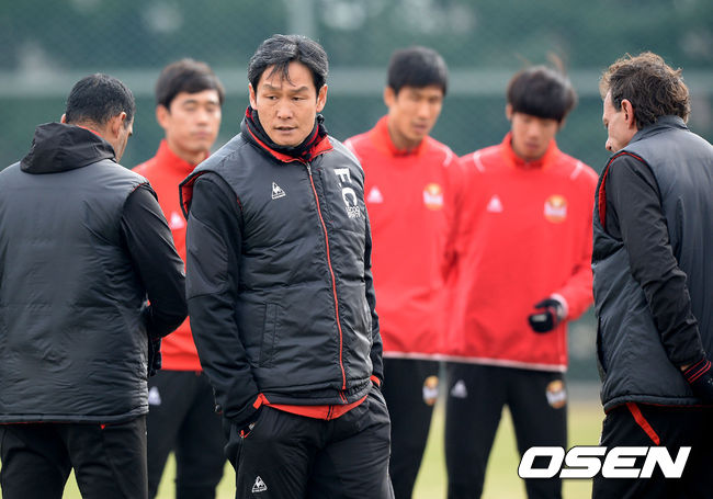 최용수 감독이 미팅을 마치고 훈련을 지켜보고 있다.
