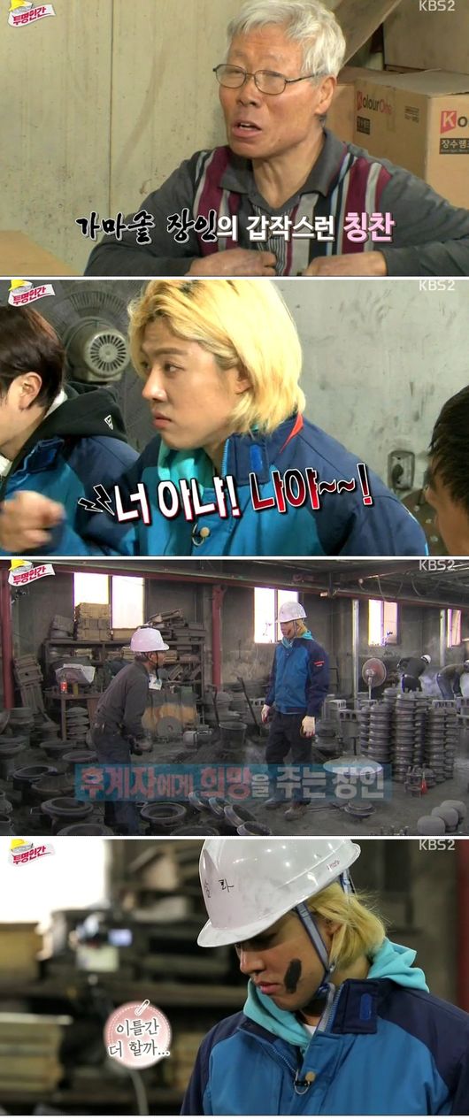 11일 방송된 KBS '투명인간'에서는 가마솥 공장에서 작업하는 멤버들의 모습이 그려졌다. 강남은 같이 일하던 40년 장인에게 "젊은 사람이 참 일을 잘한다"라는 칭찬을 받았다.