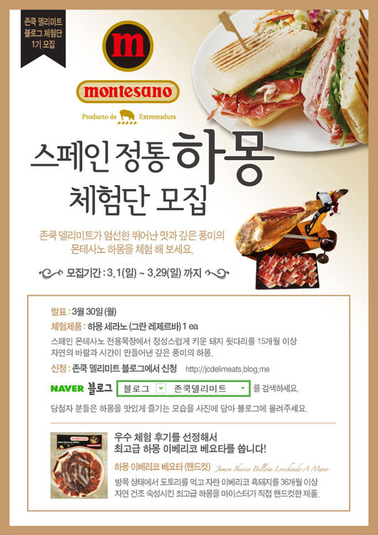 한편 하몽 출시 기념으로 3월 한달간 진행되는 몬테사노 하몽 체험단에게는 스페인 몬테사노 전용 목장에서 정성스럽게 키운 돼지의 뒷다리를 15개월 이상 숙성, 건조 시킨 하몽 세라노를 증정한다. 우수 체험 후기로 선정된 이들에게는 최고급 하몽 이베리코 베요타를 추가로 증정한다.