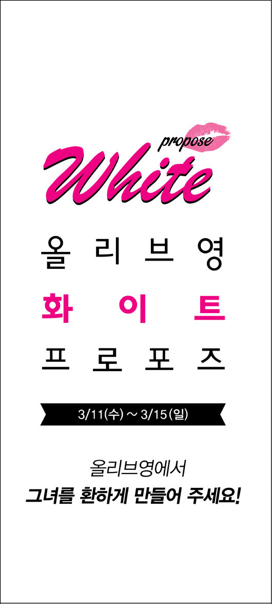 국내 대표 헬스&뷰티 스토어 '올리브영(www.oliveyoung.co.kr)'은 11일부터 15일까지 '화이트 프로포즈' 프로모션을 실시한다. 이번 '화이트 프로포즈'의 컨셉은 "올리브영에서 그녀를 환하게 만들어 주세요"로, 깨끗함을 상징하는 '화이트 컬러'로 표현한 제품 및 여성의 얼굴과 마음을 환하게 밝혀줄 선물 아이템을 제안한다.