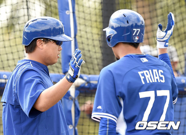 류현진이 프리배팅에서 홈런 타구를 날린 뒤 프리아스와 하이파이브를 하고 있다.