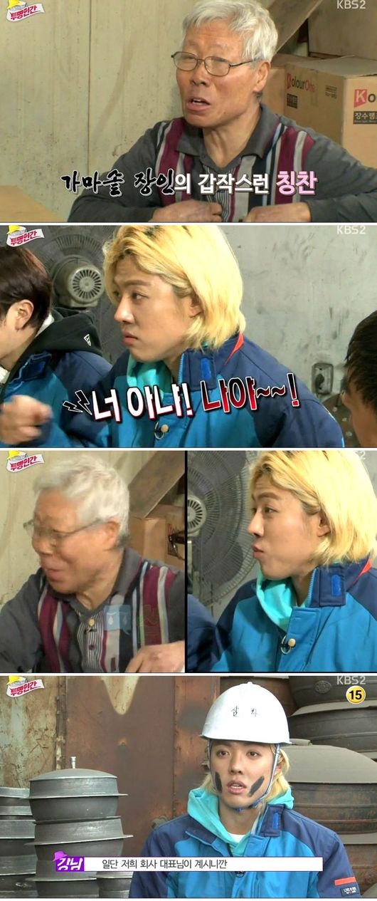 첫번째로 찾아간 곳은 가마솥 공장. 제일 먼저 도착한 강호동은 바뀐 포맷도 모른채 어리둥절했고, 사장님은 자세한 설명없이 작업복 먼저 던져주는 모습을 보였다. 이후 도착한 멤버들 역시 '멘붕'에 빠지긴 마찬가지. 정태호는 먼저 와 있는 강호동을 보며 "그 새 많이 늙었다"고 하는가 하면, 계속된 노동에 "이거 예능 맞냐?"고 볼멘 소리를 내기도 했다.