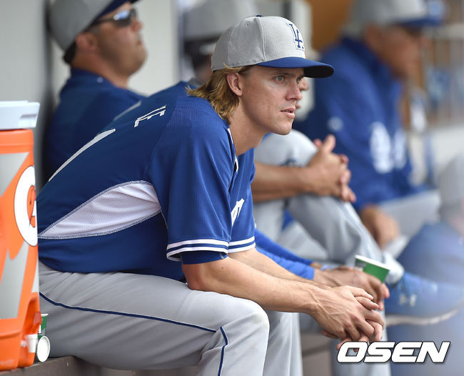 그레인키가 더그아웃에 앉아 경기를 지켜보고 있다.