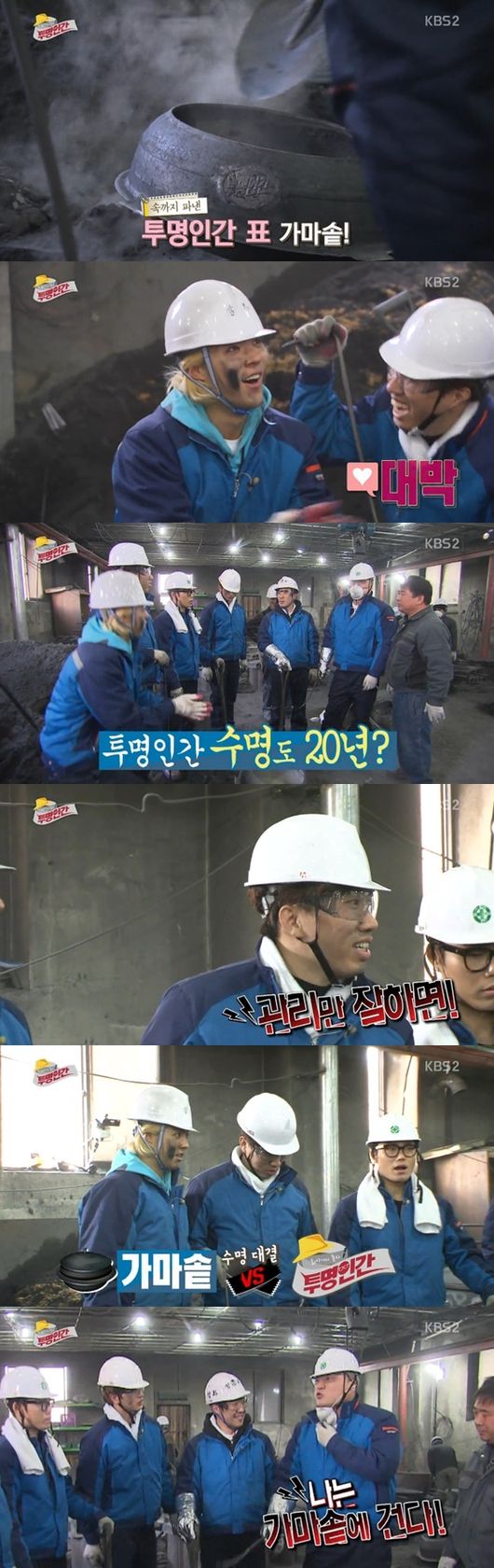 이들은 모든 과정이 공동작업인 가마솥 만들기 미션에서, 웃음대결을 할 때보다 더욱 끈끈해진 유대관계를 형성하는 모습을 보였다. 조금만 방심해도 다칠 수 있는 작업 현장에서 서로를 돕는 이들의 땀방울은 낯선 가마솥 공장을 후끈 달아오른 열기로 가득 채웠다. 또 장인은 1800도에서 펄펄 끓는 오렌지색 쇳물을 부어 우여곡절 끝에 탄생한 ‘투명인간’표 가마솥에 “기적을 이룬 거야”라는 칭찬을 전해 ‘투명인간’ 멤버들에게 뿌듯한 성취감을 안겼다.