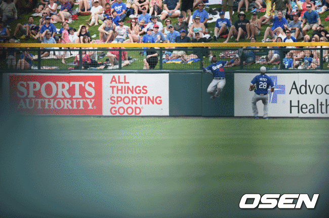 4회말 LA 다저스 푸이그가 시카고컵스 앤서니 리조의 타구를 몸을 날려 잡아내고 있다.