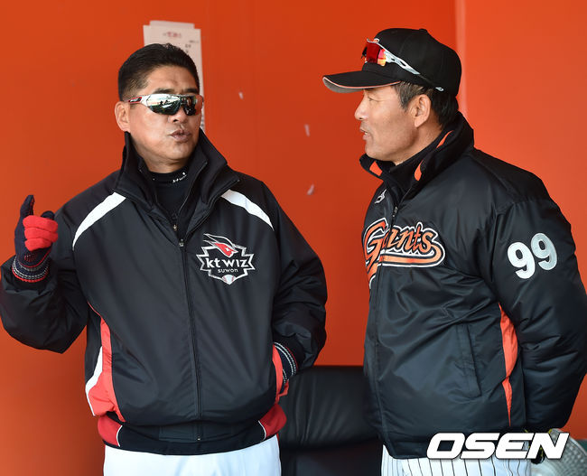 12일 오후 부산 사직구장서 ‘2015 타이어뱅크 KBO 리그’ 시범경기 롯데 자이언츠와 kt 위즈의 경기가 열릴 예정인 가운데 양팀 훈련시간에 kt 조범현 감독과 롯데 이종운 감독이 kt 덕아웃에 나와 얘기를 나누고 있다.