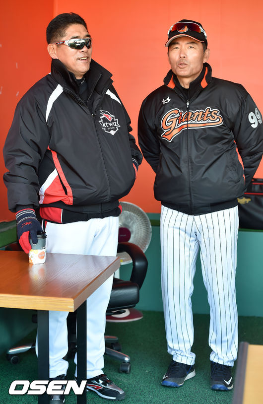 12일 오후 부산 사직구장서 ‘2015 타이어뱅크 KBO 리그’ 시범경기 롯데 자이언츠와 kt 위즈의 경기가 열릴 예정인 가운데 양팀 훈련시간에 kt 조범현 감독과 롯데 이종운 감독이 kt 덕아웃에 나와 환하게 웃으며 얘기를 나누고 있다.