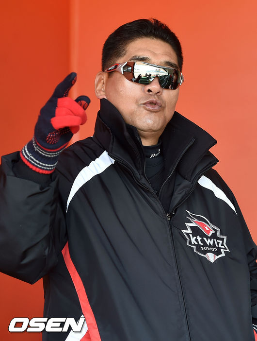 12일 오후 부산 사직구장서 ‘2015 타이어뱅크 KBO 리그’ 시범경기 롯데 자이언츠와 kt 위즈의 경기가 열릴 예정인 가운데 양팀 훈련시간에 kt 조범현 감독이 말을 하고 있다.