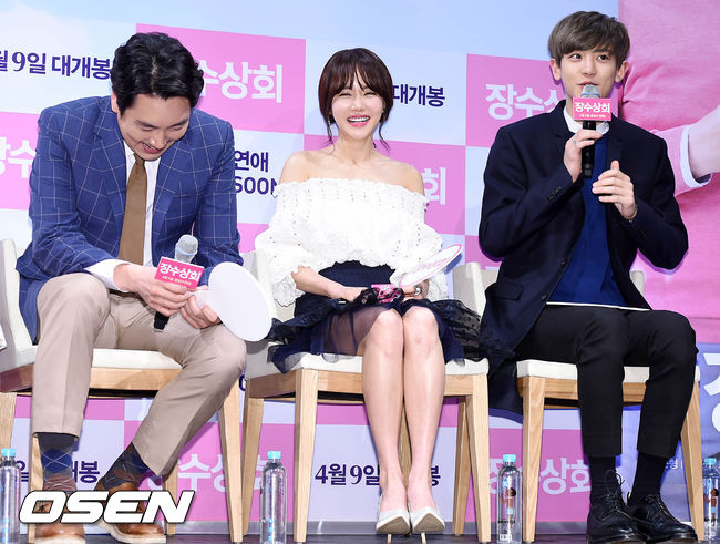 12일 오전 서울 강남구 신사동 CGV 압구정점에서 열린 영화 '장수상회' 제작보고회에서 엑소 찬열의 농담에 배우 조진웅, 황우슬혜가 미소짓고 있다.