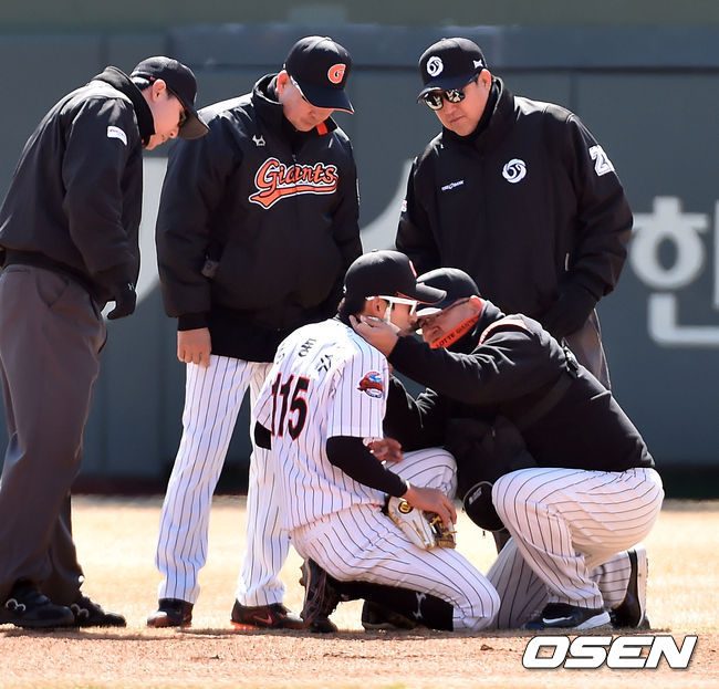 12일 오후 부산 사직구장서 ‘2015 타이어뱅크 KBO 리그’ 시범경기 롯데 자이언츠와 kt 위즈의 경기가 열렸다. 1회초 1사 kt 김진곤의 타구가 롯데 2루수 강동수를 맞고 안타가 된 후 강동수가 치료를 받고 있다.