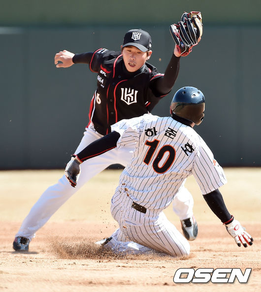 12일 오후 부산 사직구장서 ‘2015 타이어뱅크 KBO 리그’ 시범경기 롯데 자이언츠와 kt 위즈의 경기가 열렸다. 1회말 1사 주자 1루 롯데 손용석의 볼넷때 1루 주자 하준호가 도루를 시도하고 있다.