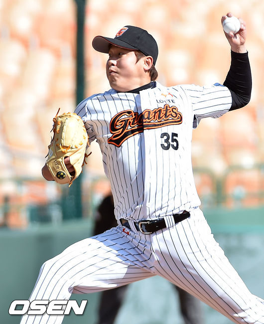 12일 오후 부산 사직구장서 ‘2015 타이어뱅크 KBO 리그’ 시범경기 롯데 자이언츠와 kt 위즈의 경기가 열렸다. 6회 마운드에 오른 롯데 이명우가 힘차게 공을 뿌리고 있다.