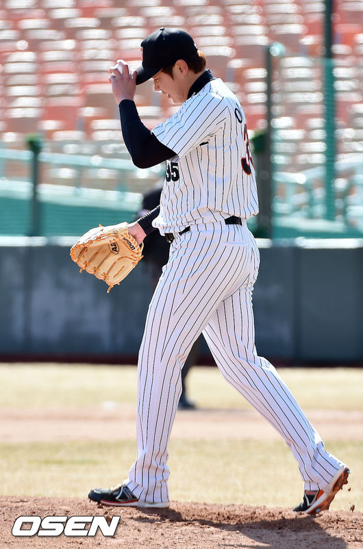 12일 오후 부산 사직구장서 ‘2015 타이어뱅크 KBO 리그’ 시범경기 롯데 자이언츠와 kt 위즈의 경기가 열렸다. 6회초 1사 주자 1루 kt 장성호에게 좌월 투런 홈런을 맞은 롯데 이명우가 아쉬워하고 있다.
