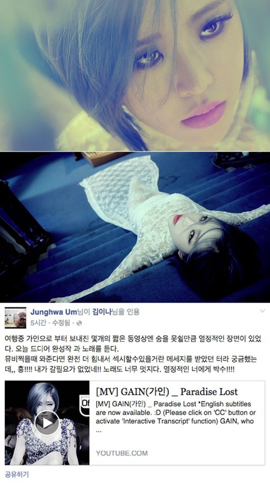 엄정화는 글과 함께 ‘하와’의 더블 타이틀곡 중 하나인 ‘파라다이스 로스트’의 뮤직비디오의 링크를 첨부하며 가인의 신곡에 애정을 보였다.