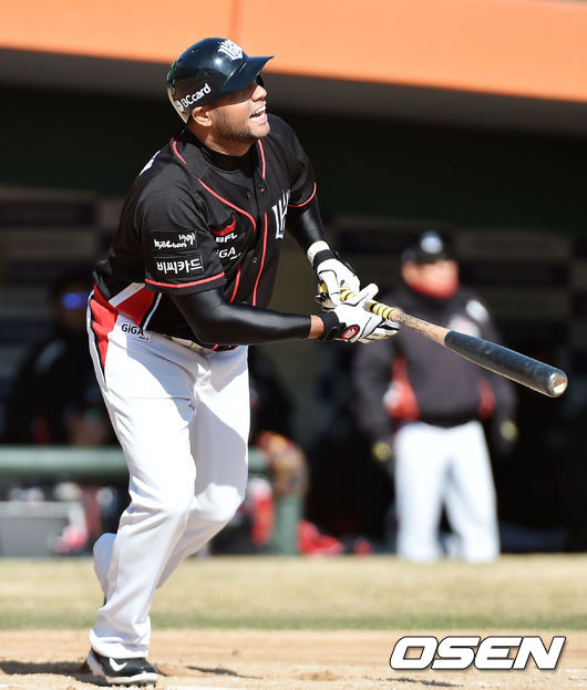 12일 오후 부산 사직구장서 ‘2015 타이어뱅크 KBO 리그’ 시범경기 롯데 자이언츠와 kt 위즈의 경기가 열렸다. 7회초 2사 주자 1루 kt 마르테가 우익수 플라이 타구를 날리고 있다.