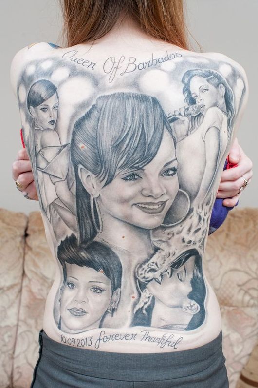 그녀는 리한나의 문신을 하기 위해 총 2000파운드(한화 약 336만원)를 썼으며 문신을 하는데 총 48시간 이상을 할애한 것으로 알려졌다. 특히 그녀의 등에는 리한나의 5개의 얼굴이 그려져 있으며 등 위 쪽에는 ‘바베이도스의 여왕’이라고 글자를 남겼다. 이는 리한나가 바베이도스 출신이기 때문인 것으로 전해졌다.