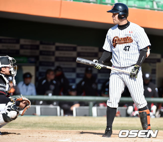 12일 오후 부산 사직구장서 ‘2015 타이어뱅크 KBO 리그’ 시범경기 롯데 자이언츠와 kt 위즈의 경기가 열렸다. 7회말 1사 대타로 나온 롯데 강민호가 타석에 서고 있다.
