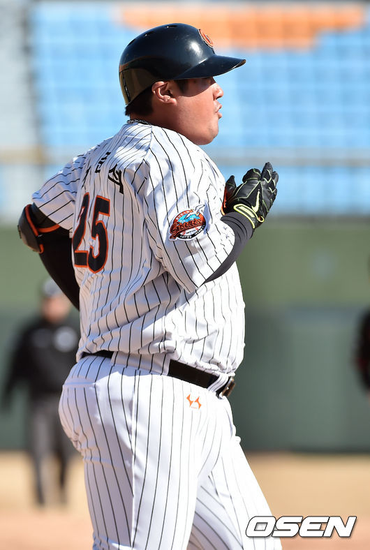 12일 오후 부산 사직구장서 ‘2015 타이어뱅크 KBO 리그’ 시범경기 롯데 자이언츠와 kt 위즈의 경기가 열렸다. 7회말 2사 대타로 나온 롯데 최준석이 유격수 땅볼 타구를 날리며 1루로 달리고 있다.