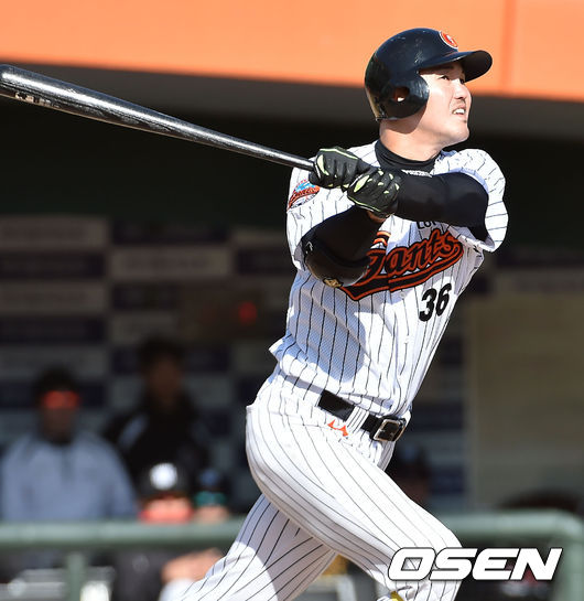 12일 오후 부산 사직구장서 ‘2015 타이어뱅크 KBO 리그’ 시범경기 롯데 자이언츠와 kt 위즈의 경기가 열렸다. 8회말 2사 대타로 나온 롯데 박종윤이 파울 타구를 날리고 있다.