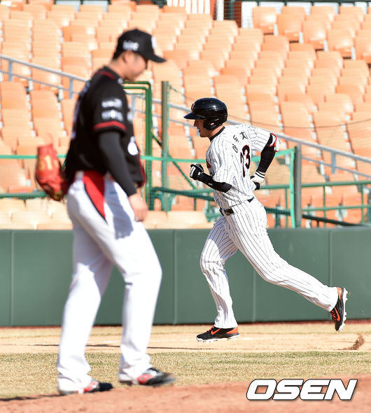 12일 오후 부산 사직구장서 ‘2015 타이어뱅크 KBO 리그’ 시범경기 롯데 자이언츠와 kt 위즈의 경기가 열렸다. 9회말 1사 주자 만루 롯데 대타 아두치가 만루 홈런을 날린 후 그라운드를 돌고 있다.
