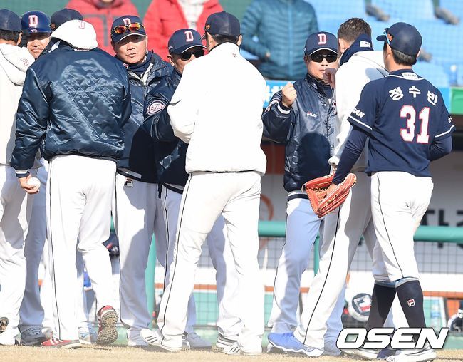 경기 종료 후 두산 김태형 감독과 외국인타자 잭 루츠를 비롯한 선수들이 인사를 나누고 있다. /dreamer@osen.co.kr