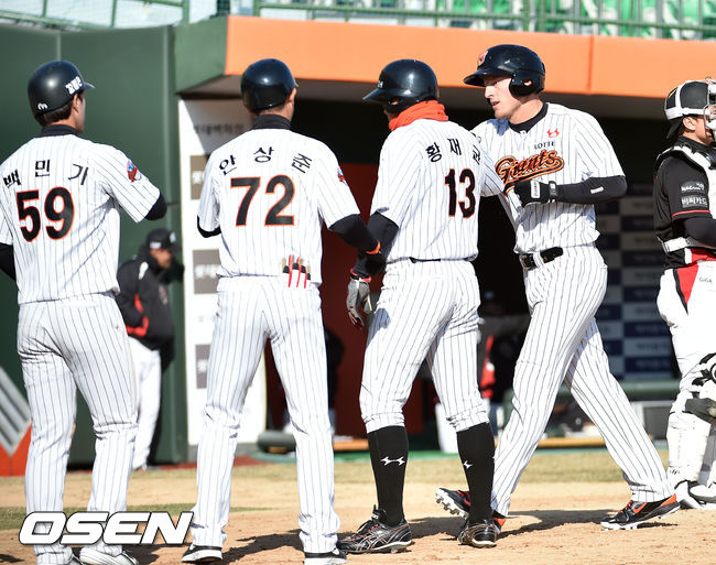 9회말 1사 주자 만루 롯데 대타 아두치가 만루 홈런을 날린 후 홈을 밟으며 동료들과 하이파이브를 하고 있다./ rumi@osen.co.kr