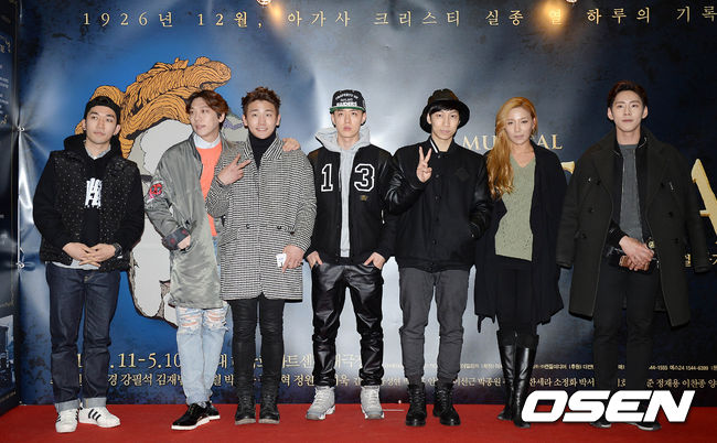 12일 오후 서울 종로구 연건동 홍익대 대학로 아트센터에서 열린 뮤지컬 '아가사'의 VIP시사회에서 댄싱9 팀이 포토타임을 갖고 있다.