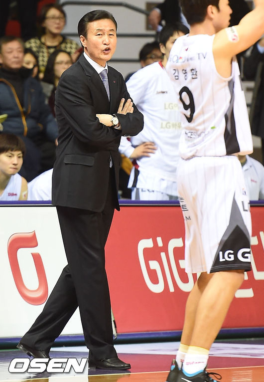 3쿼터,경기를 지켜보던 LG 김진 감독이 선수들에게 작전을 지시하고 있다.