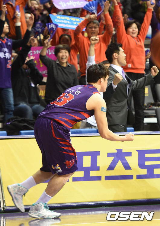 4쿼터,3점 외곽슛을 성공시킨 오리온스 이승현이 주먹을 불끈 쥐고 기뻐하고 있다.