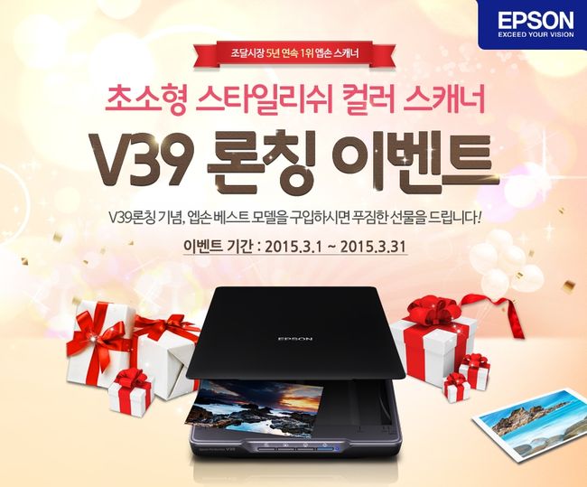 엡손은 온라인 공식 홈페이지에서 'V39 론칭 이벤트'를 진행한다. 이번 이벤트는 3월 한 달 간 '퍼펙션 V39'를 비롯한 전문가용 평판형 스캐너 4종과 급지형 고속 스캐너 4종 구매자 대상으로 진행된다. 이벤트 진행 모델은 엡손의 인기 모델인 '엡손 퍼펙션'시리즈의 'V39, V37, V370Photo, V700Photo'와 '워크포스' 시리즈의 'DS-520, DS-560, DS-760, GT-S85'이다.