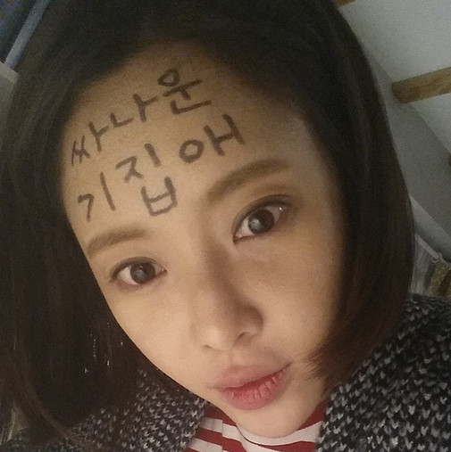 공개된 사진 속 황정음은 카메라에 얼굴을 가까이 가져다 댄 채 미소 짓고 있는 모습이다. 특히 그의 이마에는 ‘싸나운 기집애’라고 쓰여있어 보는 이들의 웃음을 자아낸다.