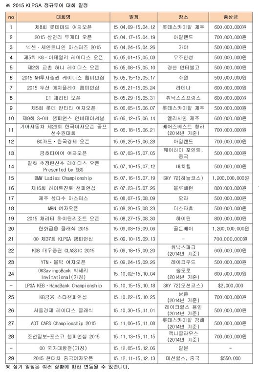 지난해 12월, ‘2014 현대차 중국 여자오픈’으로 첫 테이프를 끊은 2015시즌 KLPGA투어는 4월 9일 ‘제8회 롯데마트 여자오픈’으로 국내 개막전을 치른 뒤, 7월 넷째 주에 열리는 ‘제16회 하이트진로 챔피언십’까지 16주 연속으로 쉼 없이 달린다. 또한, 8월 셋째 주부터는 7주 연속으로, 10월 셋째 주부터 4주 연속으로 대회가 열리는 등 한 시즌 동안 바쁜 일정이 이어질 예정이다.