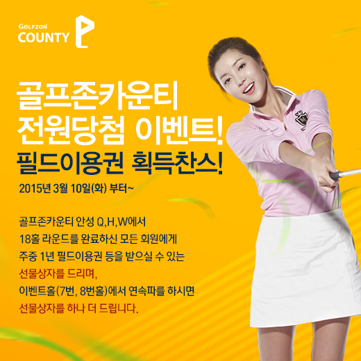 먼저 오는 4월 30일까지 '골프존카운티 안성 전원 당첨 이벤트'가 진행된다. 스크린골프 상의 골프존카운티 안성Q, H, W 코스에서 라운드 하는 모든 이용자라면, 필드 이용 기회를 제공받게 된다.