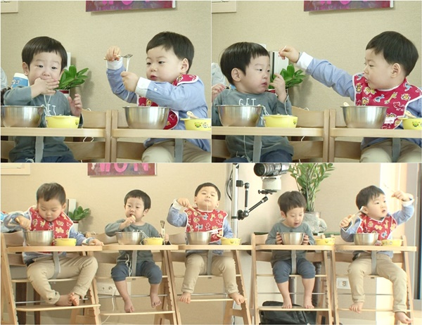 점심 식사를 위해 나란히 앉은 만세와 서준. 삼둥이 대표와 쌍둥이 대표가 함께하니 유쾌한 웃음이 끊이질 않았다. 먼저 장난에 시동을 건 것은 꾸러기계의 신성 ‘이장꾸’ 서준이었다. 서준은 만세의 국수 그릇에서 면발을 집어 먹으며 관심을 끌었고, 이에 만세는 “만세 거야!”라고 응수하며 옥신각신 국수 쟁탈전을 벌여 웃음을 자아냈다.