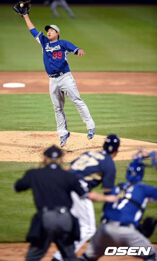 1회말 2사 다저스 류현진이 샌디에이고 맷 켐프의 타구를 잡아내고 있다.