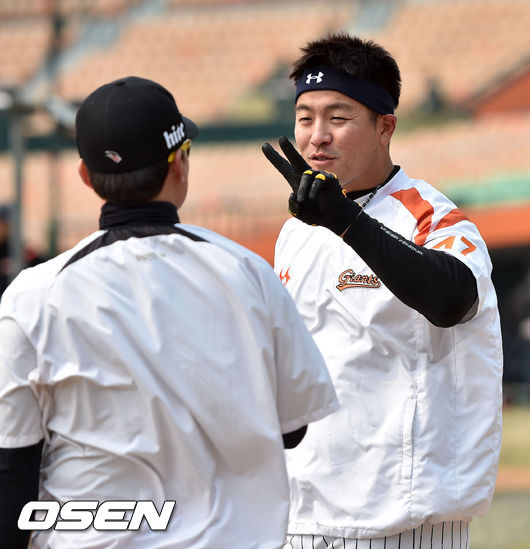 13일 오후 부산 사직구장서 ‘2015 타이어뱅크 KBO 리그’ 시범경기 롯데 자이언츠와 kt 위즈의 경기가 열릴 예정인 가운데 양팀 훈련시간에, 롯데 강민호가 kt 용덕한에게 브이 사인을 하고 있다.