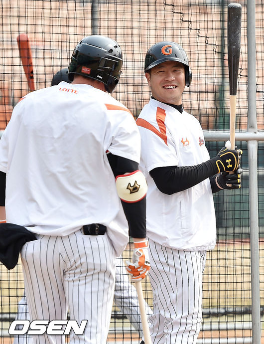 13일 오후 부산 사직구장서 ‘2015 타이어뱅크 KBO 리그’ 시범경기 롯데 자이언츠와 kt 위즈의 경기가 열릴 예정인 가운데 양팀 훈련시간에, 롯데 강민호가 아두치와 즐겁게 얘기를 하고 있다.