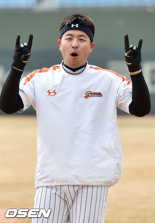 13일 오후 부산 사직구장서 ‘2015 타이어뱅크 KBO 리그’ 시범경기 롯데 자이언츠와 kt 위즈의 경기가 열릴 예정인 가운데 양팀 훈련시간에, 롯데 강민호가 취재진에게 사인을 보내고 있다.