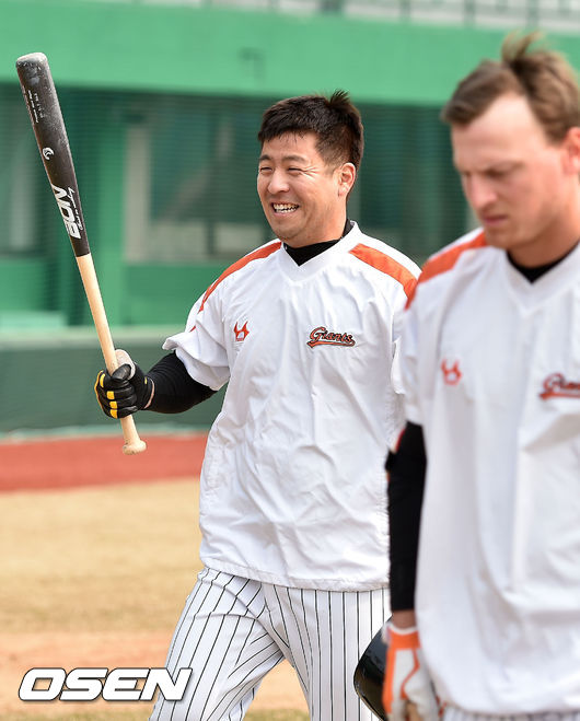 13일 오후 부산 사직구장서 ‘2015 타이어뱅크 KBO 리그’ 시범경기 롯데 자이언츠와 kt 위즈의 경기가 열릴 예정인 가운데 양팀 훈련시간에, 롯데 강민호가 타격훈련을 마친 후 미소짓고 있다.