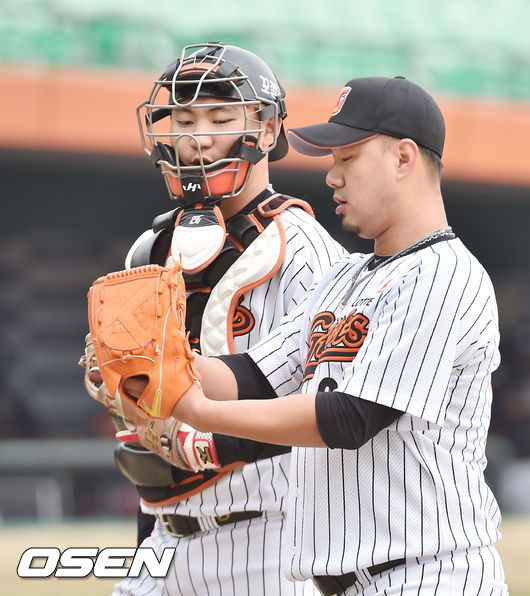 13일 오후 부산 사직구장서 ‘2015 타이어뱅크 KBO 리그’ 시범경기 롯데 자이언츠와 kt 위즈의 경기가 열렸다. 5회초 마운드에 오른 롯데 송승준이 5회를 마친 후 덕아웃으로 향하며 장성우와 얘기를 나누고 있다.