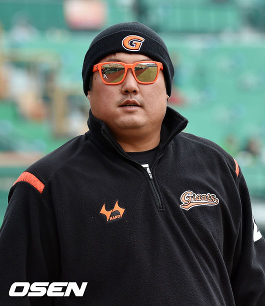 13일 오후 부산 사직구장서 ‘2015 타이어뱅크 KBO 리그’ 시범경기 롯데 자이언츠와 kt 위즈의 경기가 열렸다. 클리닝 타임때 롯데 최준석이 비니와 선글라스를 쓰고 몸을 풀기 위해 덕아웃 밖으로 나오고 잇따.