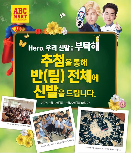 히어로 응모 이벤트는 시작의 계절 봄을 맞아 ABC마트가 매년 3월에 정기적으로 진행해오고 있는 연례 행사로, 새로운 시작점에 같은 반(팀)의 서먹서먹한 분위기를 풀어주고 서로 친해질 수 있는 계기를 만들어줘 많은 소비자들의 뜨거운 호응을 얻고 있는 행사이다.