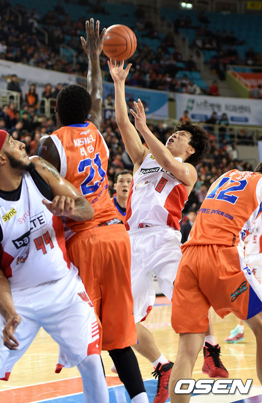 2쿼터 SK 박상오가 넘어지며 슛을 시도하고 있다.