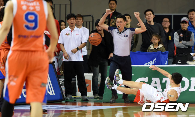 2쿼터 전자랜드 정병국과 충돌한 SK 주희정이 코트에 넘어지고 있다.