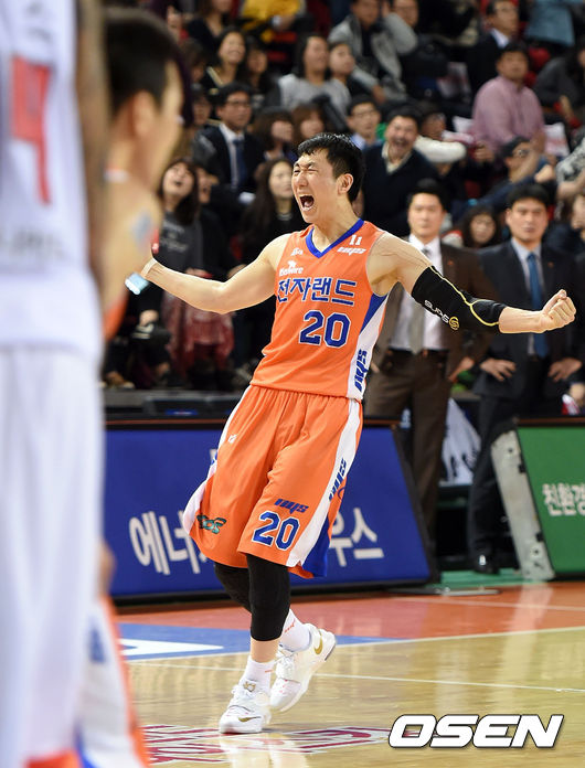 연장 3점슛을 성공시킨 전자랜드 정영삼이 환호하고 있다.