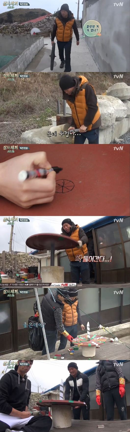 유해진이 '회전초밥'을 위한 회전판을 완성했다.