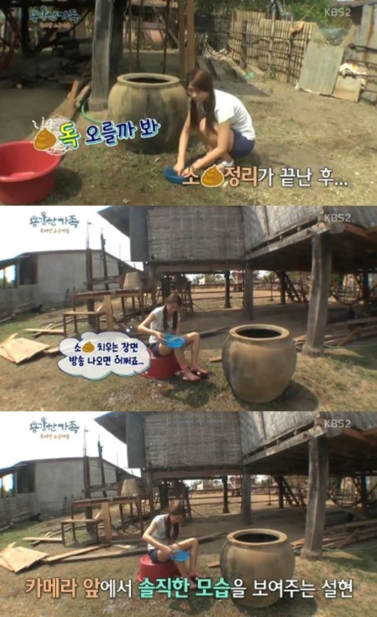 이날 설현은 소똥을 치우고 나서 독이 오를 것을 걱정하며 씻기 시작했다.